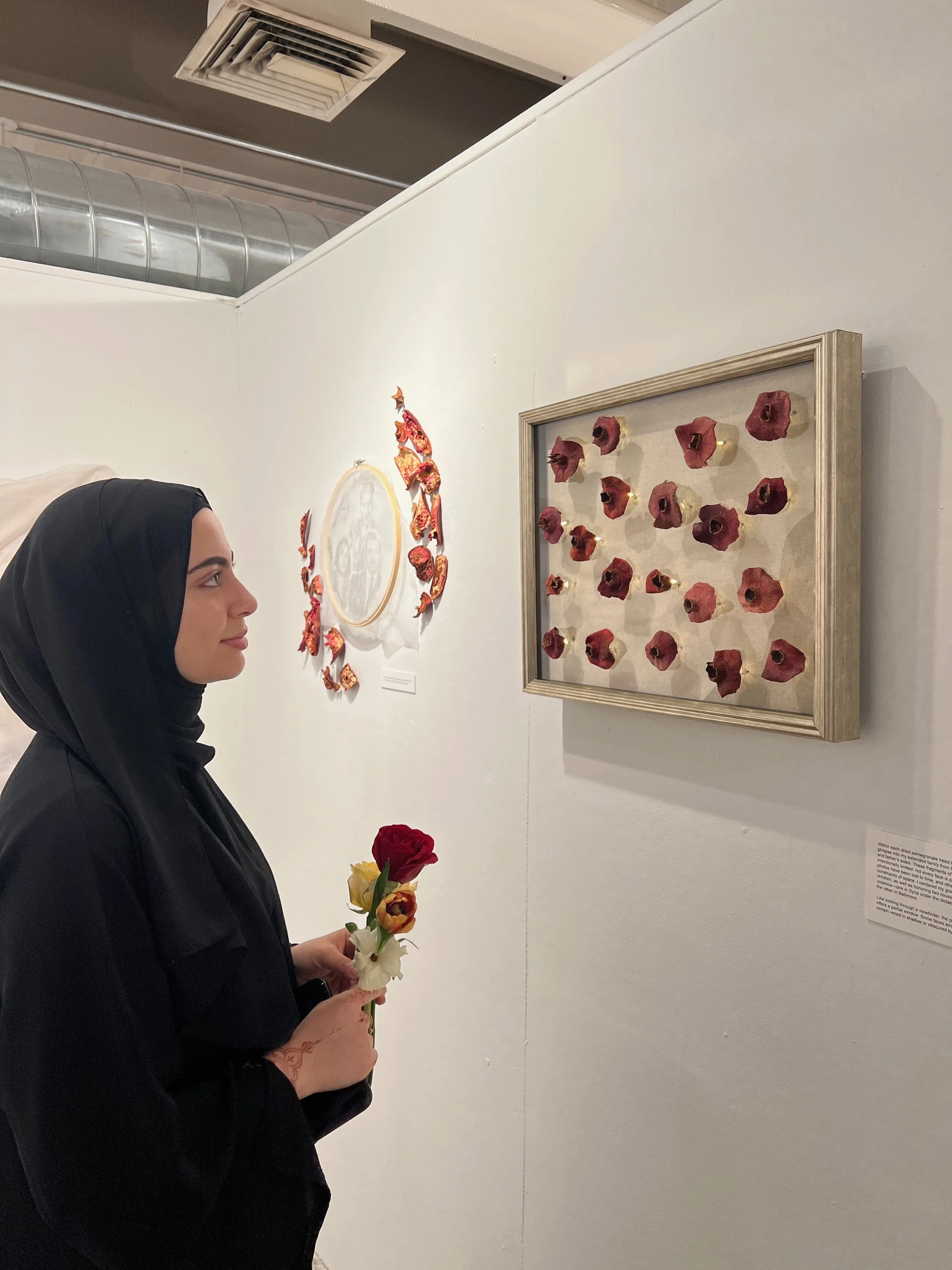 Much of my work reflects my experience as a Syrian-American, focusing on the spiritual and emotional landscapes of diaspora. Through conceptual experimentation, I explore how art can function as both archive and act of healing: a way to preserve what conflict and distance threaten to erase. I see art as a form of advocacy, healing, and connection. From video installations centering Palestine and collective resistance, to more intimate visual meditations on prayer, memory, and the motherland, I see my practice as an ongoing dialogue between grief and hope. My process often begins with reflection, listening, documenting, and reimagining; and evolves into forms that invite others to do the same.